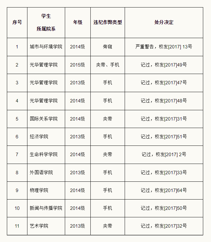 在2016-2017学年第一学期期末考试中,共发现11起本科生考试违纪作弊案例,经有关院系和教务部调查审核,均已处理完毕。