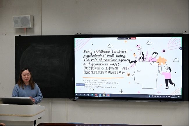 教育学院博士生张誉月以《关于智能辅导系统的文献综述》为题; 硕士生旷欣然以《论语启示录:人工智能洪流中教育的为何、何为与何如》为题; 香港教育大学黎奕轩以《香港职业与专业教育学员对微凭证的看法》为题, 最后张善行以《幼儿教育教师心理健康之研究》为题。
