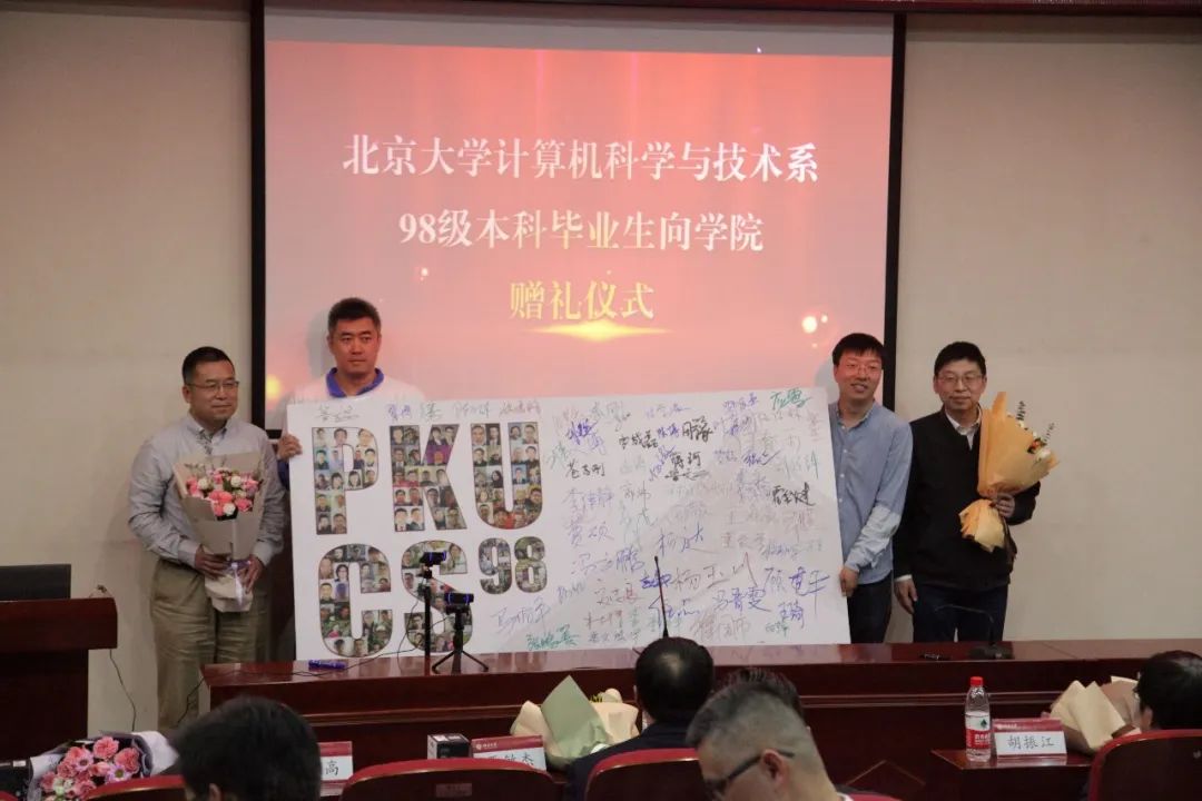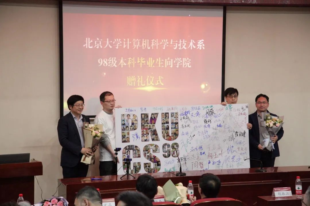 校友们分别向计算机学院和集成电路学院赠送了由每个同学照片组成的PKUCS98及亲笔签名的画板墙。魏朋表示,学院会继续做好校友服务工作,并希望校友们能够多回到学院看看。康晋锋分享了曾经作为班主任的体会,并祝校友们工作顺利。