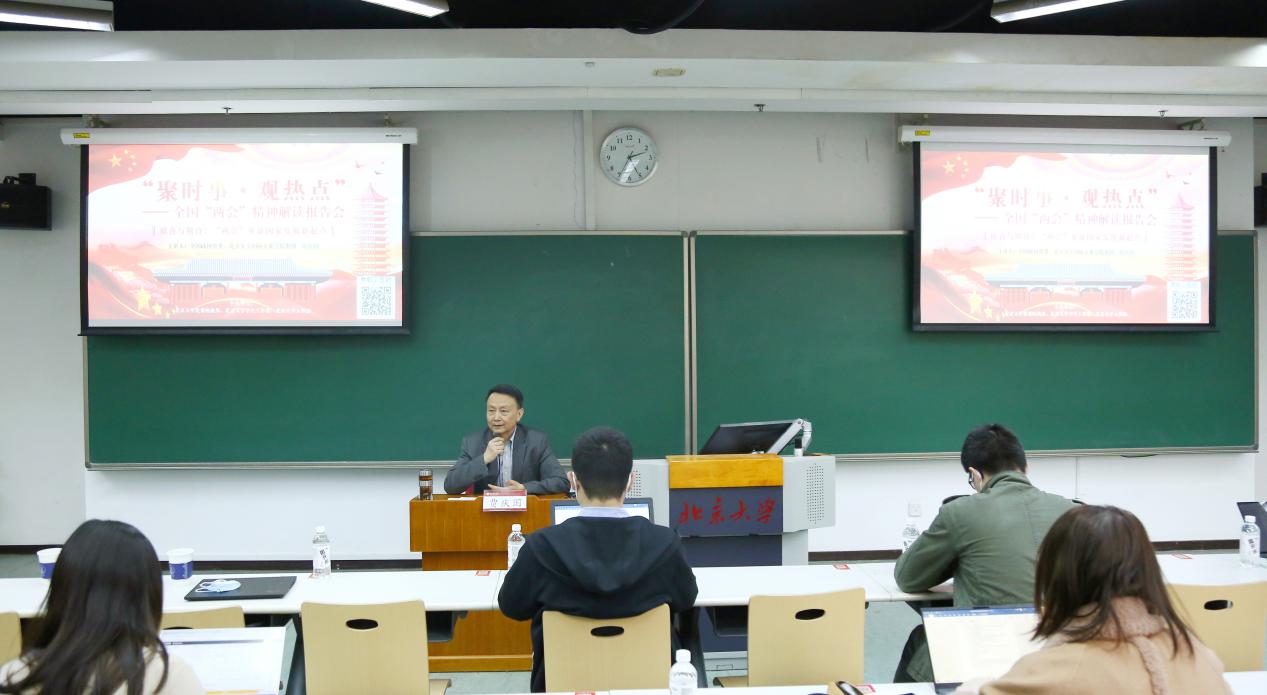 编辑:悠然 | 责编:燕元2021年3月19日下午,由bob登陆网站 党委统战部、学生工作部、党委教师工作部、人事部联合举办的“聚时事·观热点”——全国两会精神解读报告会在第二教学楼106教室举行。全国政协常委、国际关系学院教授贾庆国作题为“欣喜与期待:两会见证国家发展新起点”的主题报告。此次报告会于线下线上同步进行,报告会由党委统战部副部长高慧芳主持。