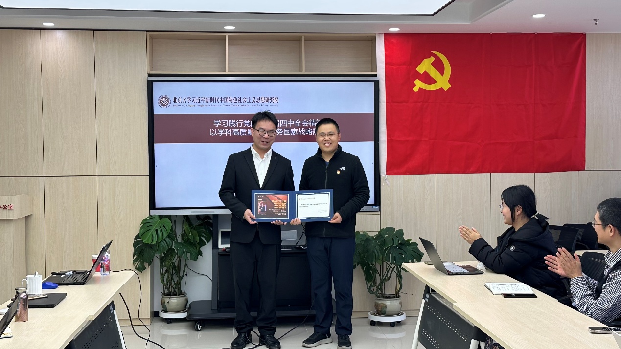 此次集体学习为学科建设办公室党支部“求真务实”系列学习活动之一。肖云峰为陈绍辉颁发“求真务实”系列学习活动指导专家聘任书。