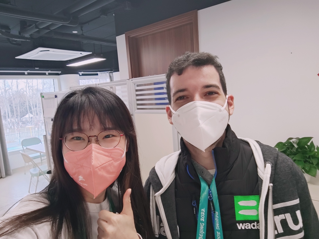 语言服务志愿者何璠和杜姝格同车,她们在冰立方的大家庭入口分开。何璠除了要负责翻译,还要在冰立方的奥林匹克大家庭休息室接待外宾。对于有些“社恐”的她而言,每天早上在门口向外宾打招呼是个小挑战。一开始的时候,她总是以无声的方式完成她的接待。“我会在帮外宾们刷电梯卡的时候点头致敬,但是我总觉得主动跟别人说早上好甚至聊天是一个难以完成的任务。”意外的是,在微笑着点头致敬后,她总能收到外宾热情的问好,这也鼓励了她走出舒适圈,尝试着说出了第一句热情得有些夸张的“早上好”,得到了她人生中第一个pin。“我觉得这是一个双向的促进,你很热情地跟别人打招呼,别人也会很热情地跟你打招呼,这些祝福语既让他们开启了美好的一天,也让我自己的心情变好了很多。”