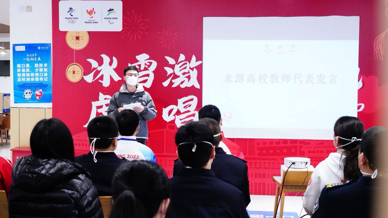 来源高校教师代表、对外经贸大学辅导员闫奕超表达了对冬奥盛事、驻地专班、驻地师生的感谢。生逢盛世、参与盛事,作为高校辅导员,他将会继续将学生放在心上、将使命担在肩上,用全心全意的热情,与青年比肩、与时代同向、与祖国同行。