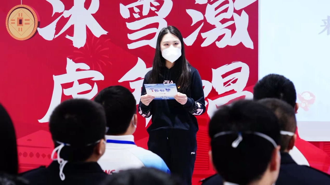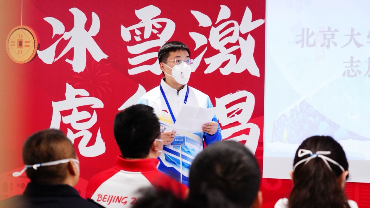 志愿者代表刘超、沈思宇、赵蔓讲述了参与冬奥、冬残奥服务保障的故事,表达了对驻地老师和工作人员的感谢,分享了参与国家重大活动的感受和体悟。