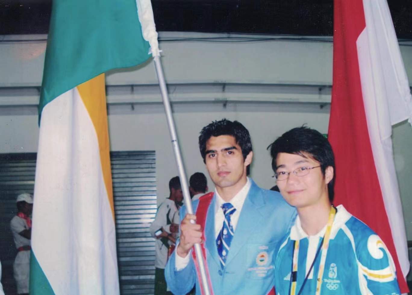 张忞煜参加奥运会闭幕式时和印度代表团旗手的合影