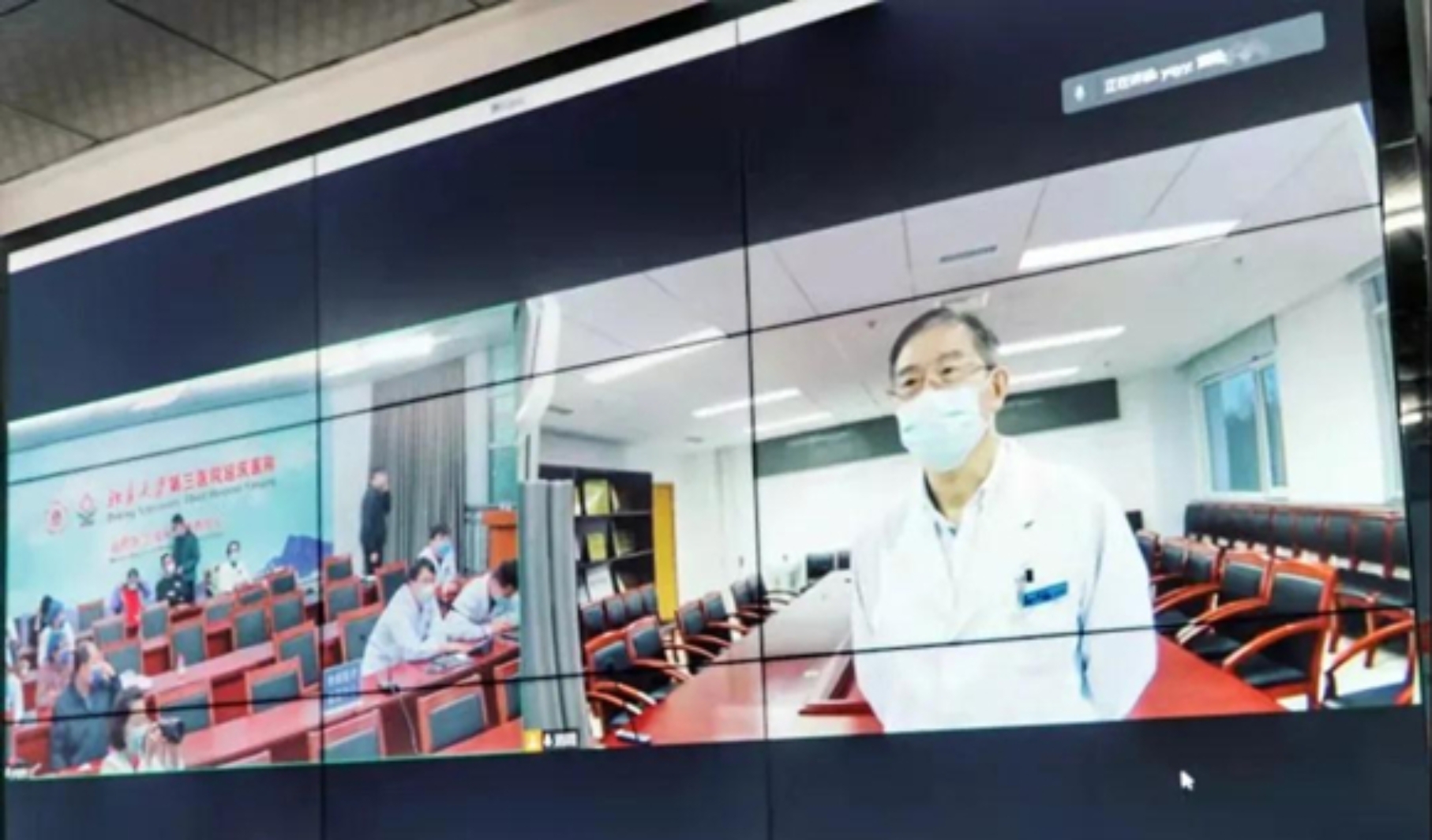 北医三院创伤中心主任、延庆医院执行院长周方带领医疗队,在门诊5层通过5G远程会诊中心指导冬奥保障楼内的同事救治患者