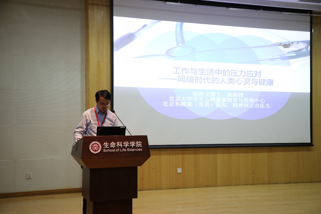 心理中心总督导、副主任徐凯文为大家带来了一场以“压力来源与认知应对”为题的讲座,与老师们分享了他对于压力的理解以及一些应对压力的技巧。徐凯文借助滴滴总裁柳青患病在身仍坚持工作、自己同专业师妹熬夜高效翻译教材等真实事例,表明过于追求完美和以及由此导致的持续压力会将一个人压垮,并严重影响人的身心健康,从而指出压力应对和情绪管理是实现一个人身心幸福的关键。徐凯文结合自身从医多年接触的真实案例,阐明现代人身体和心理的问题往往是由于不健康的生活方式导致的。而压力很多时候不是来自于人的需求,而是由于我们受到环境的影响,人逐渐被物质所役化。随着科技发展的进步,人的能力虽然得到了提升,然而劳动量却与日俱增,压力也随之增长。如何应对压力和情绪管理对个人实现身心幸福有重要意义。徐凯文分享了一些应对压力的方法:养成良好生活方式和习惯、保持阳光心态、保持信任,建立依恋和亲密关系来应对孤独,保持精神上的追求等。