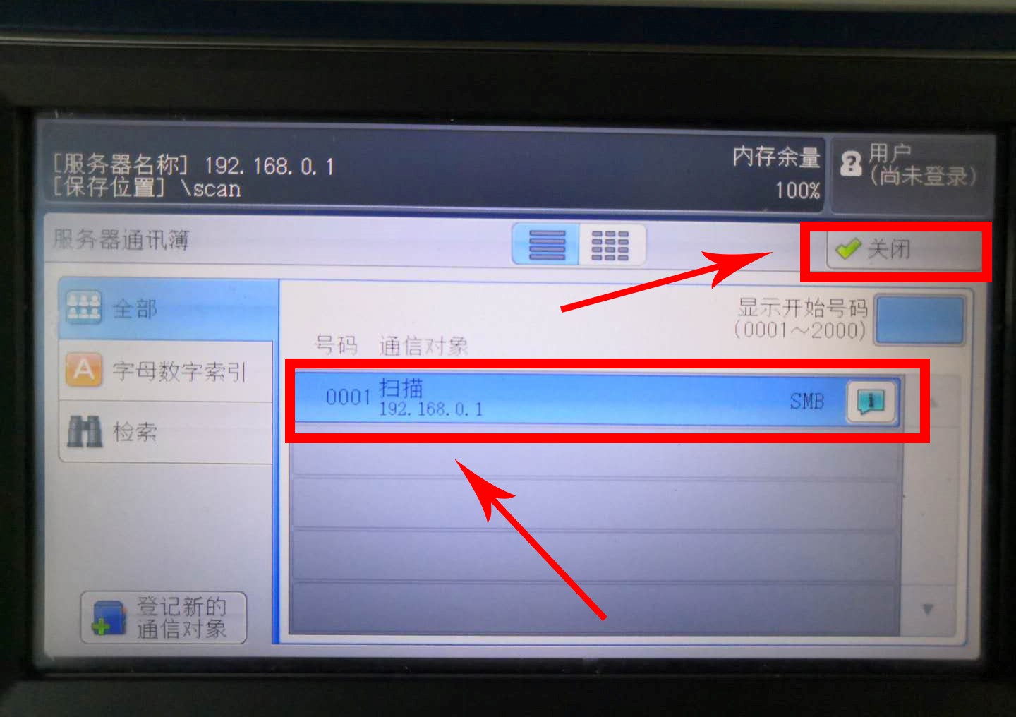 (6)在触摸显示屏上,点击“0001 扫描 192.168.0.1”来指定文件保存位置,如需修改色彩,格式,清晰度,请点击触摸显示屏上的关闭按钮,如果不需要色彩,格式,清晰度等设置,请点击启动按钮,开始进行扫描。如图6(注:请勿选择其他通信对象,否则扫描无效 )
