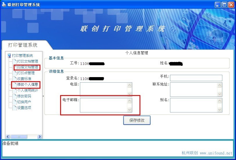 (1)如果是要将扫描文件发送到指定邮箱,请先登录联创客户端,设置指定邮箱(建议为北大邮箱,校外邮箱容易出现邮件无法正常发送到情况),如图1,若无邮箱, 则扫描文件会保存到服务器(联创打印管理系统),以供下载至本地。(扫描文件在服务器保留2周,2周后自动删除)。如无客户端请先下载安装联创自助打印驱动程序。