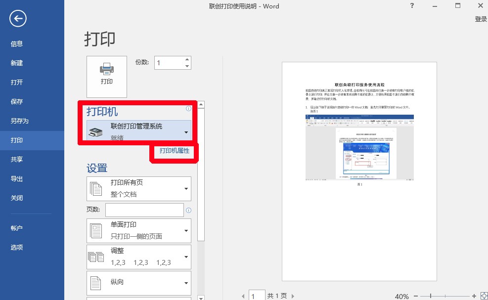 (4)现在您可以使用"联创自助打印机"体验方便快捷的自助式打印功能了。现以如下例子说明如何自助打印一份Word文档:首先打开需要打印的Word文件。点击左上角文件选项,选择左方打印选项,打印机选择"联创打印管理系统"。如图四